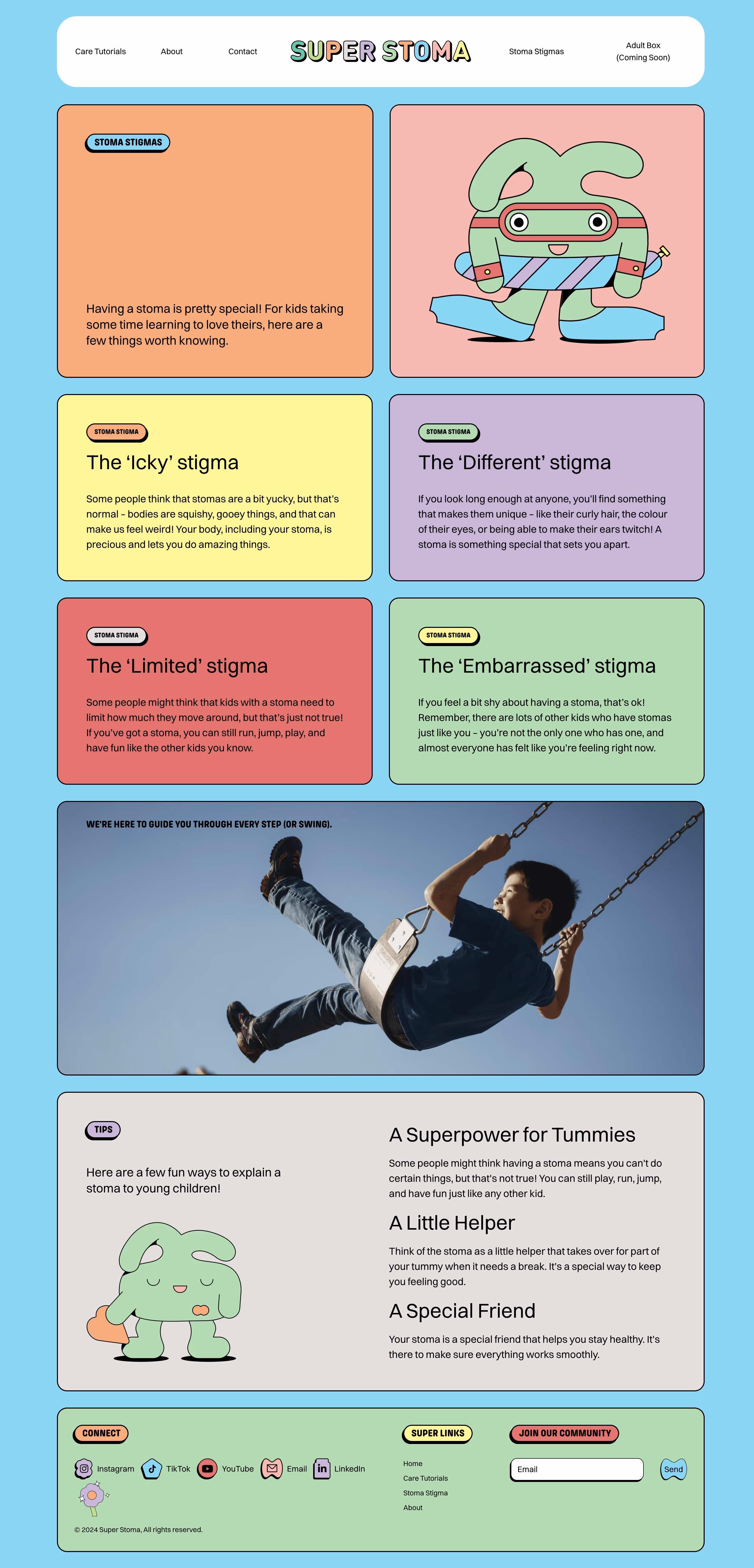 The Super Stoma website, crafted by Daniel Ting Chong, showcases his signature blend of bold illustrations and playful design, transforming a sensitive healthcare topic into an engaging and approachable experience.